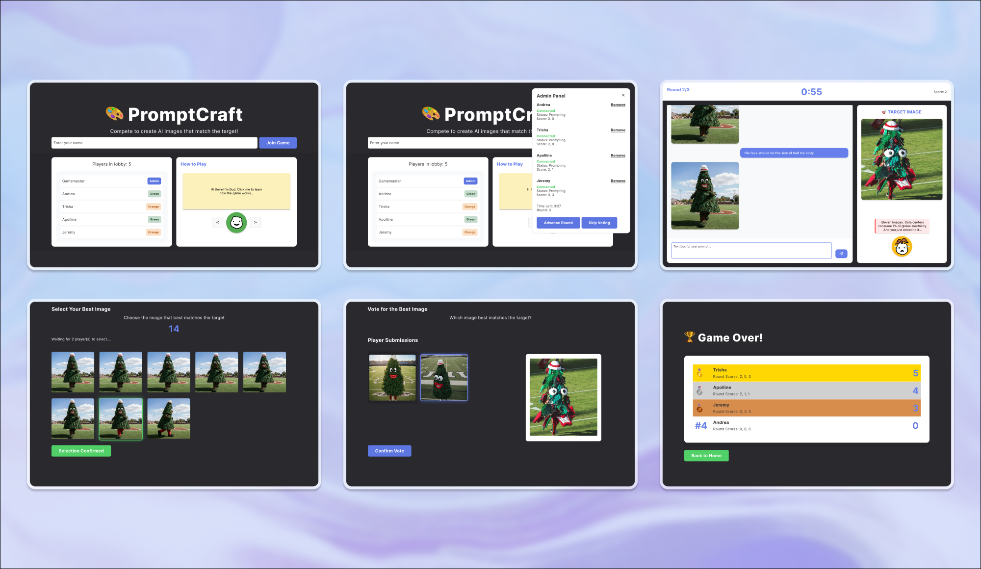 I developed the end-to-end user journey to meet the experiment and product requirements, while keeping the experience accessible and engaging. To gamify the experience, players earn votes from peers in each round based on their outputs. In each round, participants have 5 minutes to generate images, then select their personal best, and vote on everyone's submitted creations.